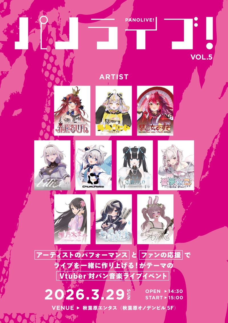 このたび、2026年3月29日(日)開催VTuber対バン音楽ライブイベント「パノライブ!vol.5」に、